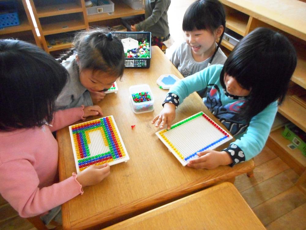 保育室には、たくさんのおもちゃや遊びの道具などがおかれ、そのなかに、保育士が意図的に配置した遊びや学びの道具を含めることによって、子どもが主体的に選択し、遊ぶことができるようになっています。